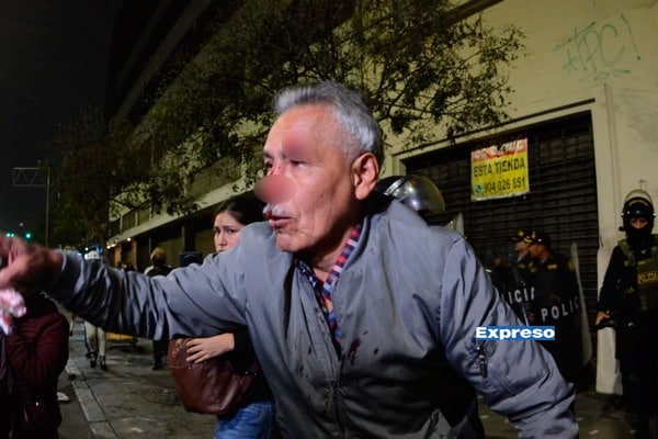 Luego de haber dado varios empujones a efectivos de la Policía Nacional que resguardaban la marcha, un adulto mayor identificado como Marcelo Santos de la Cruz recibió varazos en el rostro, los cuales le hicieron sangrar.