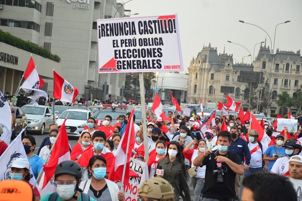 Tras concentrarse en la Plaza San Martín del Cercado de Lima, cientos de ciudadanos protestaron contra el gobierno de Pedro Castillo y exigieron su renuncia. La manifestación exigió justicia por los muertos en las protestas de los últimos días, así como la salida del mandatario, como forma de solución a la grave crisis política y social que atraviesa el país.