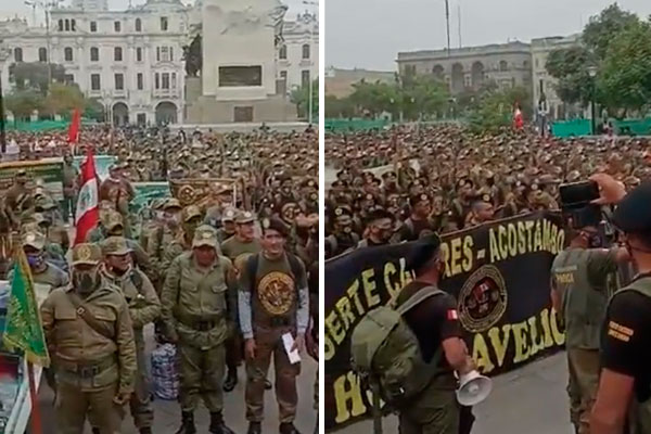 En un video difundido en redes sociales, se aprecia a los reservistas en el Centro de Lima y se escucha estribillos de rechazo al jefe de Estado. En las imágenes se observa a excomandos del Ejército colmar la plaza.