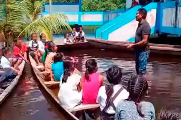 Loreto: maestro dicta clases con pies en el agua tras inundación | Alumnos reciben enseñanzas sentados sobre botes