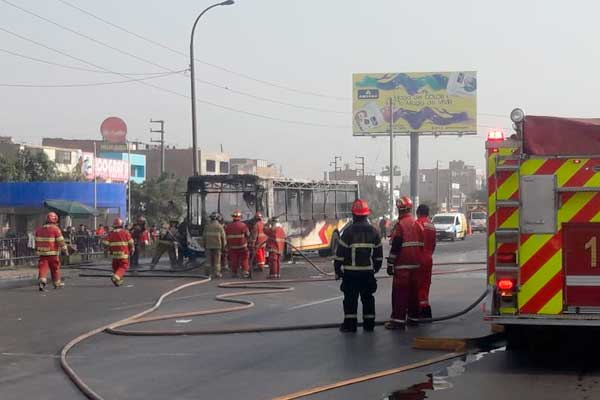 La Policía Nacional informó que un ómnibus de transporte público de pasajeros se incendió a la altura del kilómetro 22 de la Panamericana Norte, en el distrito de Los Olivos.