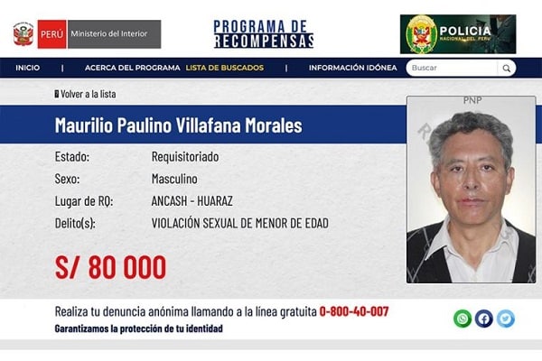 Con el fin de conseguir información del paradero del sacerdote que violó a una niña de 9 años, el Ministerio del Interior (Mininter) ofrecerá a 80,000 soles de recompensa, a quien logre dar con la ubicación Maurilio Villafana Morales para que cumpla su condena de por vida en la cárcel.