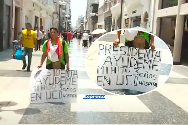 Abdel Eugenio Chávez Orué, un ciudadano de Chimbote, suplica ayuda urgente, con cartel en mano, a la presidenta Dina Boluarte, para que su hijo, Jordan Gianpierre Chávez Olivero, de 32 años, pueda acceder a un tratamiento médico especializado en el extranjero.
