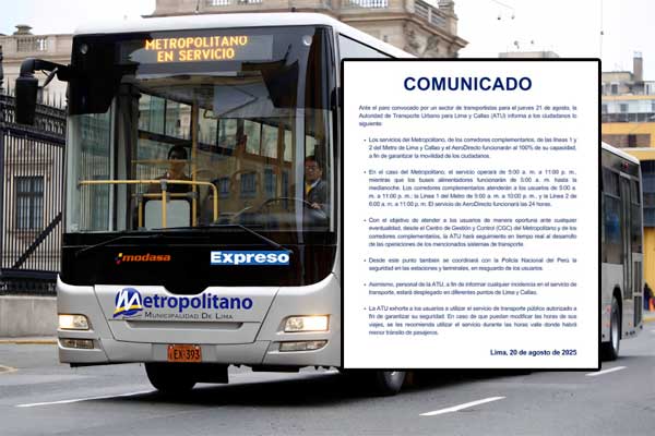 La Autoridad de Transporte Urbano para Lima y Callao (ATU) confirmó que los principales servicios de transporte público funcionarán al 100% de su capacidad este jueves 21 de agosto, día en que los gremios de transporte convocaron un paro como medida de protesta contra la creciente criminalidad en la capital.