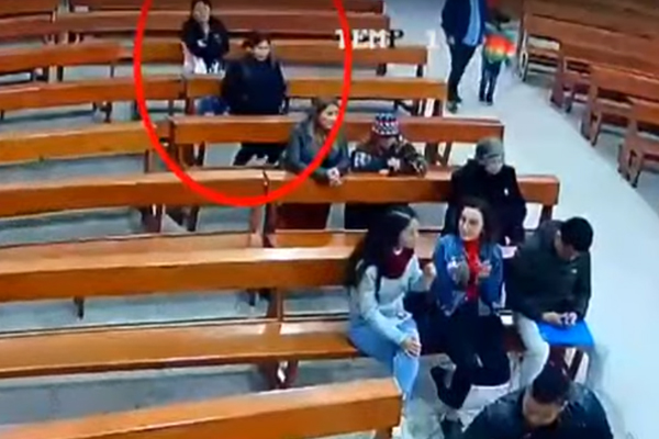 Al notar vulnerable a la mujer, una arrebata la cartera y se lo pasa a su cómplice. Ya con lo robado se retiran de la iglesia como si no hubiera pasado nada.