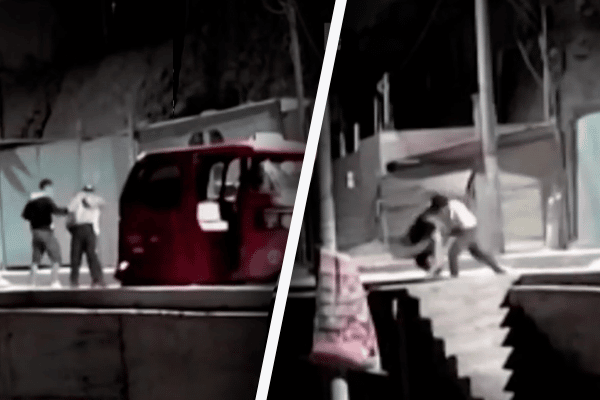 La víctima se dirigía a su vivienda cuando fue interceptado por una mototaxi roja, donde desciende uno de los asaltantes a perseguir al muchacho. Segundos después, llega su cómplice quien sujeta al joven por la espalda para quitarle todas sus pertenencias y termina lazándolo al vacío.