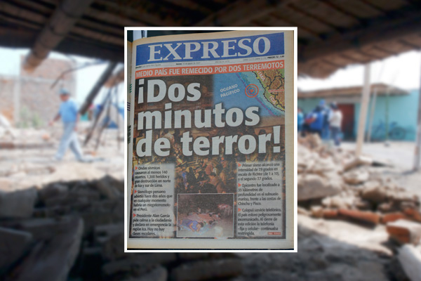 "Dos minutos de terror", decía la portada del ejemplar del 16 de agosto de 2007, el día posterior al catastrófico movimiento telúrico. EXPRESO detalló que, alrededor de las 6:41 de la tarde, dos terremotos consecutivos, el más fuerte de 7.9 grados, causaron pánico en el país por más de 120 segundos.