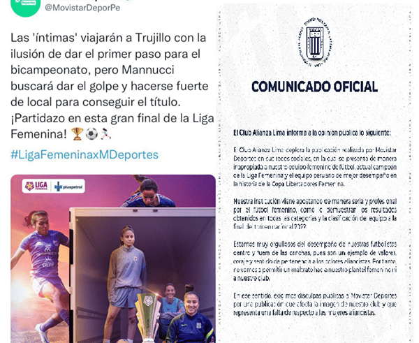 «El Club Alianza Lima deplora la publicación realizada por Movistar Deportes en sus redes sociales en la cual se presenta de manera inapropiada a nuestro equipo femenino de fútbol, actual campeón de la Liga Femenina y el equipo peruano de mejor desempeño en la historia de la Copa Libertadores Femenina», así inició el mensaje emitido por el cuadro íntimo.