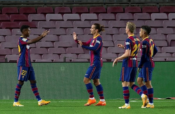 4 - Barcelona: Neto; Sergi Roberto, Piqué, Lenglet, Jordi Alba; Sergio Busquets (Pjanic, min.78), Frenkie de Jong; Messi, Ansu Fati (Dembélé, min.70), Coutinho (Pedri, min.70); Griezmann (Trincao, min.78).