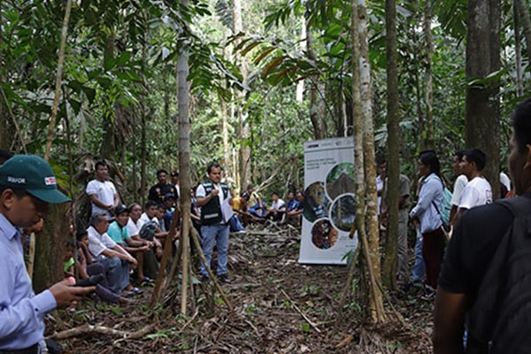 Posteriormente, los apus o líderes de las 63 comunidades nativas participantes, se dirigieron al bosque donde fortalecieron y enriquecieron sus conocimientos para la demarcación clara de linderos, identificación y ubicación de árboles aprovechables, entre otras responsabilidades, que forman parte de sus Declaraciones de Manejo (DEMA), las cuales les permite el aprovechamiento legal de los recursos de sus bosques.