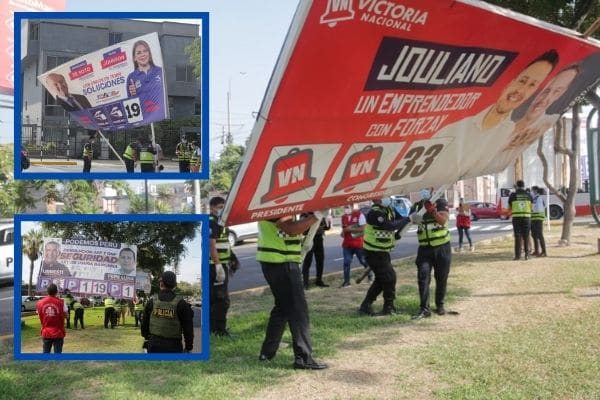 La Municipalidad de San Isidro, representantes del Jurado Nacional de Elecciones y la Policía Nacional del Perú se percataron de pancartas y paneles de propaganda electoral puesta en espacios no autorizados por la comuna.
