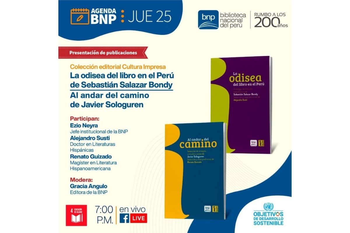 La Biblioteca Nacional del Perú (BNP) presenta su nueva colección editorial, Cultura Impresa, junto a sus dos primeros títulos: “La odisea del libro en el Perú. Antología de artículos periodísticos” de Sebastián Salazar Bondy y “Al andar del camino. Selección de ensayos, artículos y notas” de Javier Sologuren. El lanzamiento se realizará a través de un conversatorio que se desarrollará hoy a las 7:00 p.m., por el Facebook de la BNP.