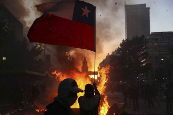 Las protestas lucían menos violentas que el lunes, cuando la policía reprimió con gas lacrimógeno a los manifestantes y un gran incendio afectó a una galería comercial en pleno centro de Santiago.