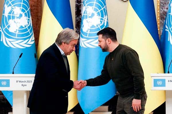 El secretario general de Naciones Unidas (ONU), António Guterres, se reunió este miércoles en Kiev con el presidente ucraniano, Volodímir Zelenski, para buscar soluciones que permitan alcanzar el objetivo final de una ‘paz justa’, según dijo el primero en declaraciones a la prensa.