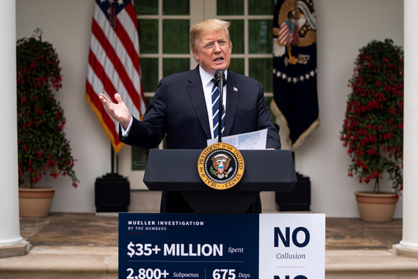 Trump habló desde un podio que llevaba adherido un cartel con estadísticas sobre el coste de la ya concluida investigación del fiscal especial Robert Mueller sobre Rusia, y su lema habitual para referirse a ella: "No (hubo) conspiración, no (hubo) obstrucción".