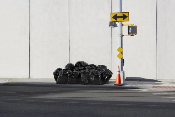 El "Trash Bag Sofa" está hecho con 15 bolsas de tela negra que imita el cuero rellenas de espuma y unidas por un cordón que en conjunto se asemejan a un montón de bolsas de basura de plástico abandonadas en una acera o callejón de cualquier ciudad del mundo.