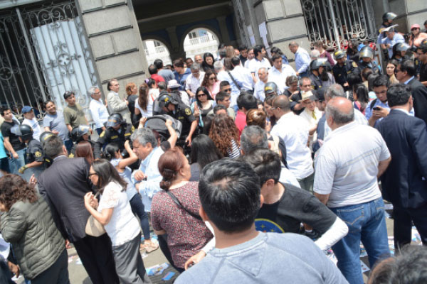 Ellas fueron empujadas porque cientos de abogados se habían agolpado en la entrada, y los efectivos de la Policía Nacional presentes no se daban abasto.