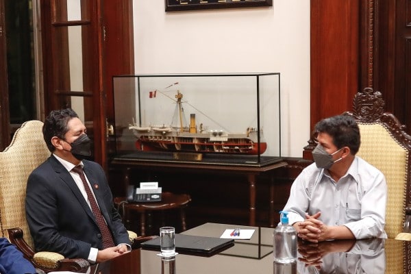 El secretario general de Perú Libre, Vladimir Cerrón, y congresistas de Acción Popular y Alianza para el Progreso acudieron la noche del lunes al despacho de Pedro Castillo, en Palacio de Gobierno, previo a la presentación del gabinete que lidera Aníbal Torres para solicitar el voto de confianza.