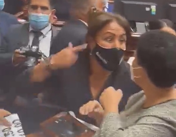 En un video difundido en redes sociales, se puede observar a la también presidenta de la Comisión de la Mujer del Congreso exhaltada señalando a Moyano.