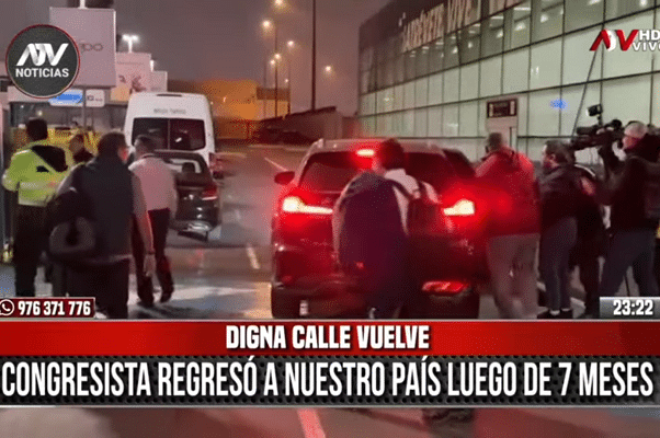 La legisladora Digna Calle llegó alrededor las 11:15 p.m. del martes escoltada por personal de seguridad en el Aeropuerto Internacional Jorge Chávez (Callao). Subió de manera rauda a su vehículo, sin prestar declaraciones a los medios de comunicación que la esperaban en el terminal aéreo.