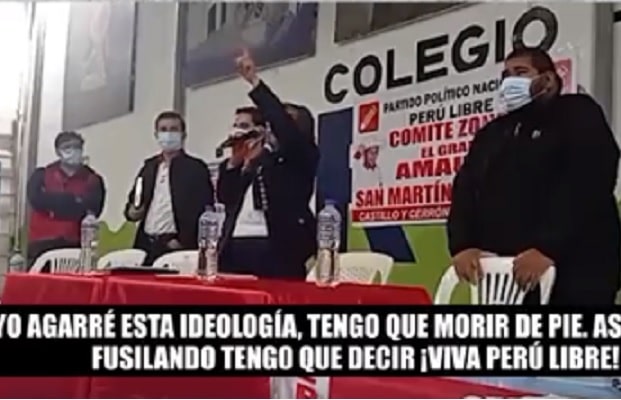 En lo que sería un evento proselitista, la señora exclama delante de los asistentes consignas políticas de lealtad hacia Perú Libre: "Si yo agarré esta ideología tengo que morir de pie, así me estén fusilando tengo que decir: ¡Viva Perú Libre!".