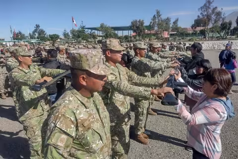 Imagen Actualidad 11 Abr 2023 - 14:35 Ejército Peruano: entregan armas a 600 jóvenes que decidieron servir al Perú voluntariamente Después de 10 semanas de instrucción ahora estarán al frente de la Guarnición de Arequipa. Imagen Actualidad 9 Abr 2023 - 04:14 Piura: soldados rescatan y trasladan a zonas seguras a decenas de moradores aislados tras lluvias Efectivos del Ejército intensifican rescate en zona de desastre, donde los pobladores perdieron sus enseres tras precipitaciones. Imagen Actualidad 18 Mar 2023 - 20:10 Militares y policías apoyaban a un clan de la droga en el Vraem El CCFFAA informó la captura de personal de seguridad del terrorista Quispe Palomino. Además, un soldado muere en enfrentamiento. Imagen Actualidad 14 Mar 2023 - 04:43 Vraem: soldado pierde la vida en enfrentamiento con senderistas Valeroso militar fue identificado como Emanuel Guimarea. Imagen Actualidad 5 Mar 2023 - 14:00 Puno: un militar muerto y cinco desaparecidos en río Ilave ante bloqueo de vías Horas antes, en Juli, extremistas incendiaron la comisaría, la base militar y la sede del Poder Judicial. Imagen Actualidad 30 Ene 2023 - 07:30 Ejército llega a Ica para unirse a la PNP en el desbloqueo de carreteras Castrenses trabajarán para recuperar las vías tomadas por revoltosos en el sur del Perú. Imagen Judicial 23 Ene 2023 - 23:20 Caso Gasolinazo: Poder Judicial evalúa este martes prisión preventiva Modus operandi de la supuesta red criminal sería sustracción y comercialización de combustible. Imagen Política TOP de noticias 10 Dic 2022 - 01:50 Ejército reafirma su respeto a la Constitución Dina Boluarte destaca que gracias a las FF.AA. vivimos en orden y respetando el Estado de derecho. Imagen Política 10 Nov 2022 - 11:59 Digna Calle pide citar a comandante del Ejército por denuncia de violación en su hogar Segunda vicepresidenta del Parlamento solicita que Walter Córdova asista a la Comisión de Defensa Nacional. Cargar más PUBLICIDAD